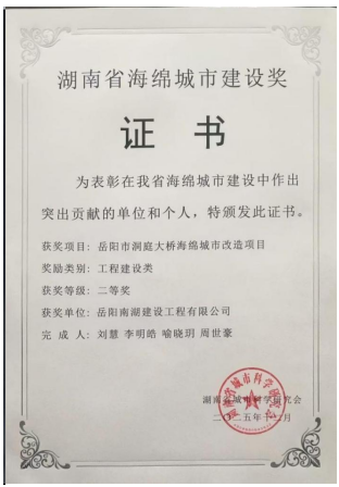 近日,由我集團(tuán)下屬岳陽南湖建設(shè)工程有限公司建設(shè)的洞庭大橋海綿城市項(xiàng)目,經(jīng)岳陽市住建局推薦申報(bào),榮獲湖南省城市科學(xué)研究會(huì)頒發(fā)的工程建設(shè)類二等獎(jiǎng)。這份榮譽(yù)既是對項(xiàng)目建設(shè)品質(zhì)的高度認(rèn)可,更是對公司專業(yè)實(shí)力與專業(yè)技術(shù)水平的充分肯定。