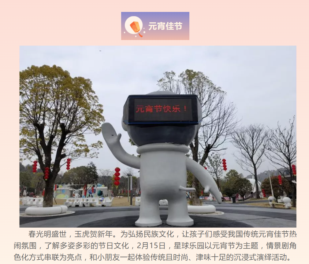 本次星球樂園元宵節(jié)主題演繹活動大獲成功,受到了孩子和家長們的一致好評,節(jié)日氛圍給孩子們留下了深刻的記憶點,為中國傳統(tǒng)節(jié)日文化與孩子們建立聯(lián)結(jié),進一步讓孩子們深刻感受到傳統(tǒng)節(jié)日的歡樂氛圍和獨特的魅力。